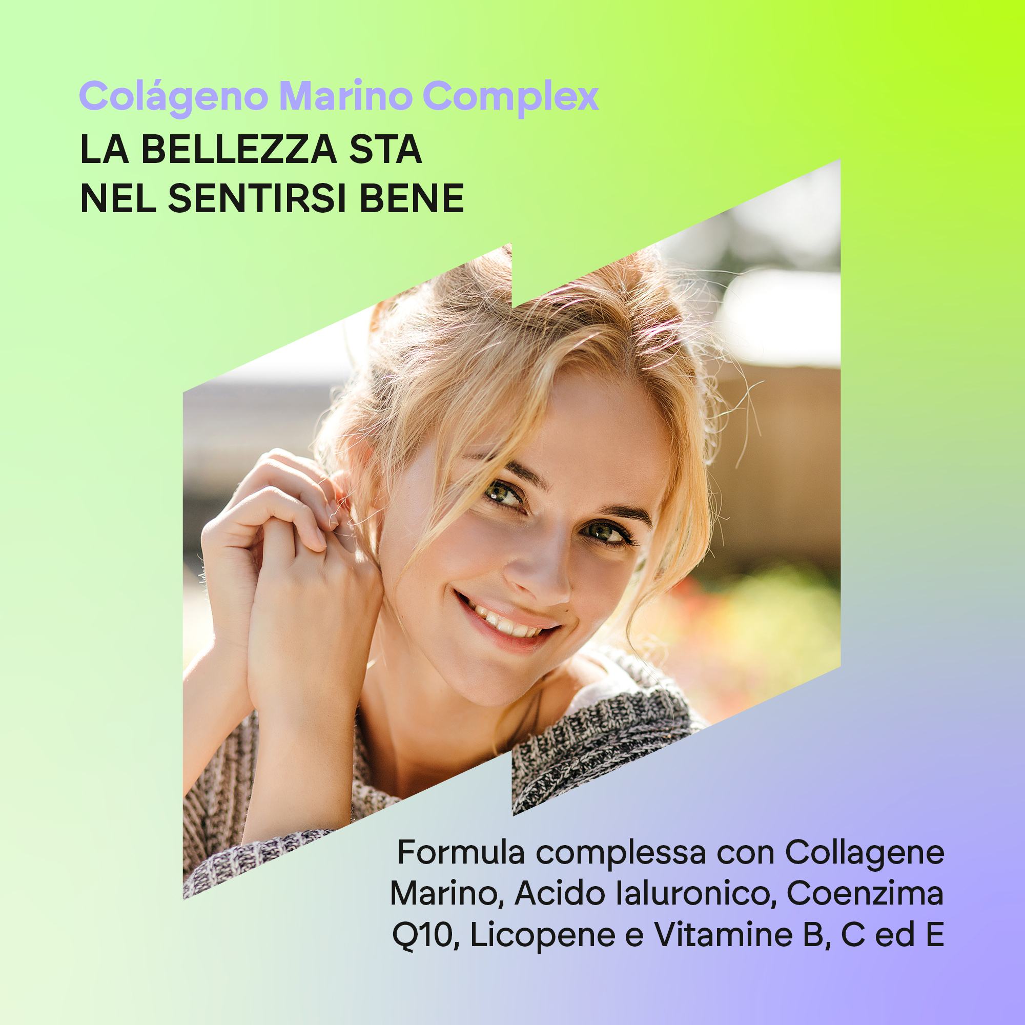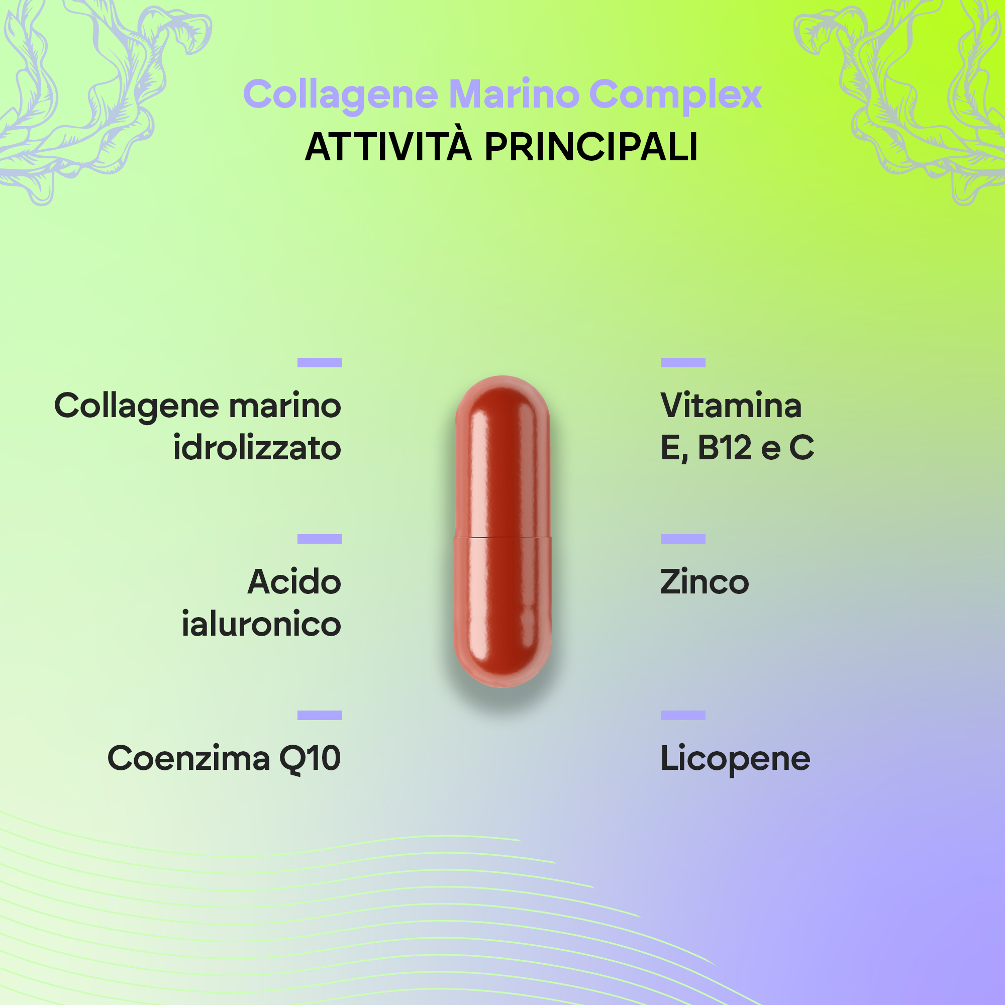 Collagene idrolizzato (pesce), capsula (agente di rivestimento: idrossipropilmetilcellulosa, colorante: ossidi e idrossidi di ferro), licopene, ialuronato di sodio, acido L-ascorbico (vitamina C), antiagglomeranti (sali di magnesio degli acidi grassi e biossido di silicio), coenzima Q10, solfato di zinco, acetato di DL-alfa-tocoferile (vitamina E), cianocobalamina (vitamina B12).