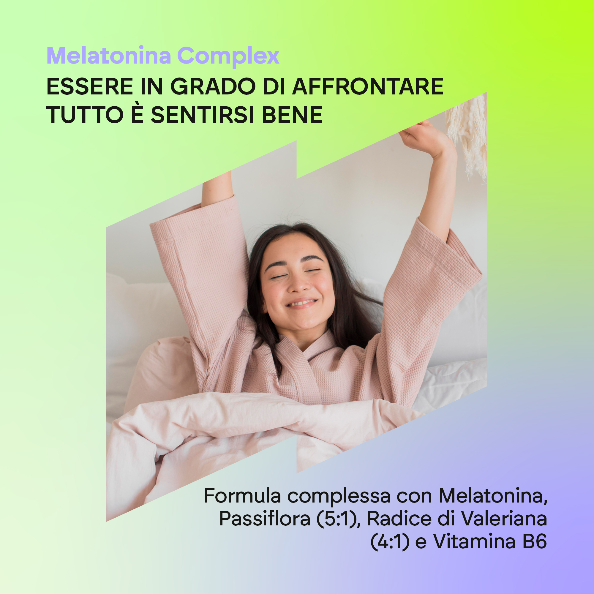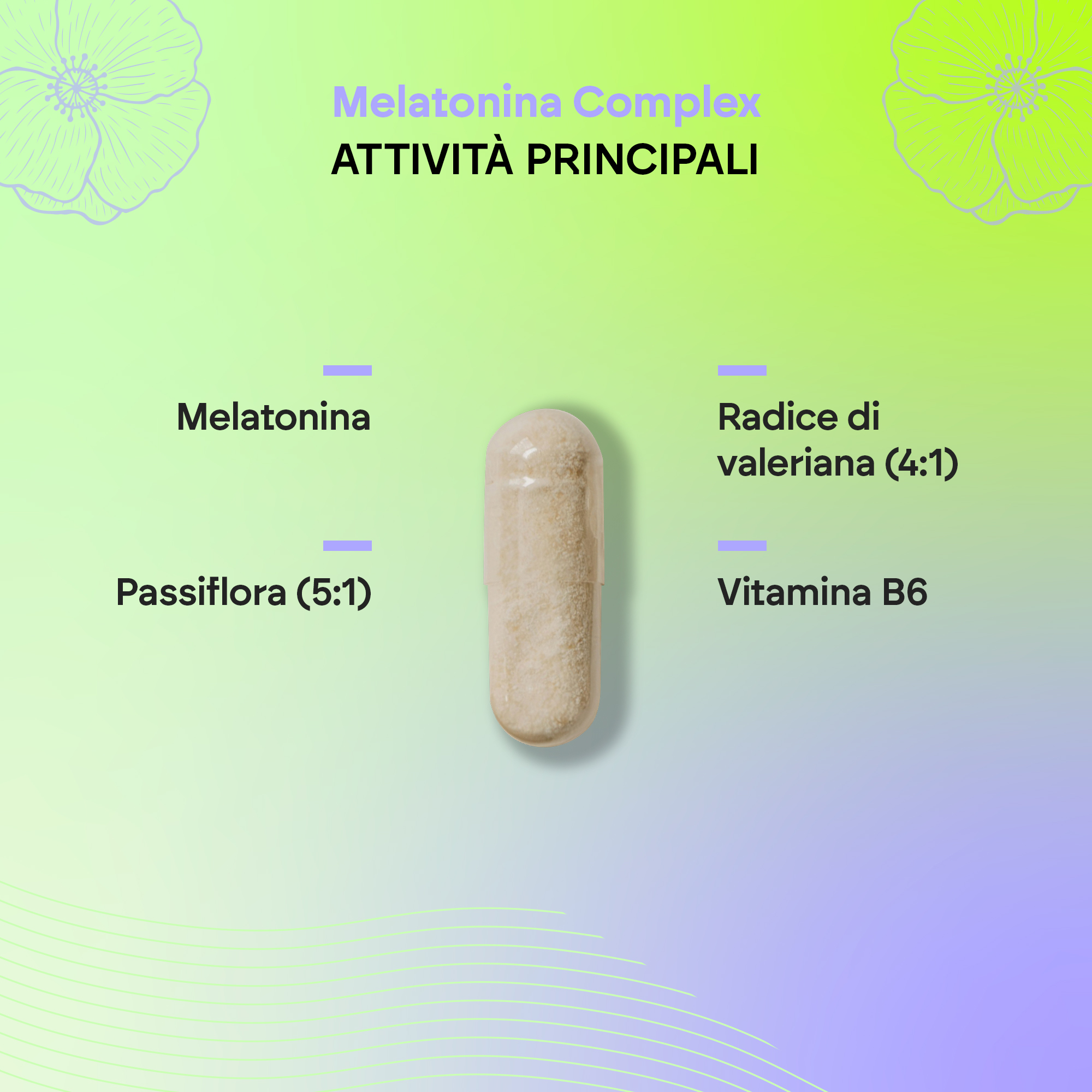 Estratto secco di papavero della California (Eschscholtzia californica Cham., parti aeree), estratto secco di Passiflora (Passiflora Incarnata L. , parti aeree), estratto secco di Melissa (Melissa officinalis L., foglia), capsula: agente di rivestimento (Idrossi-propil-metilcellulosa), estratto secco di Tiglio (Tilia platyphyllos Scop., Fiore ), estratto secco di valeriana (Valeriana officinalis L., radice), agente di carica (cellulosa microcristallina), agenti antiagglomeranti (magnesio stearato e biossido di silicio), melatonina, cloridrato di piridossina (vitamina B6).