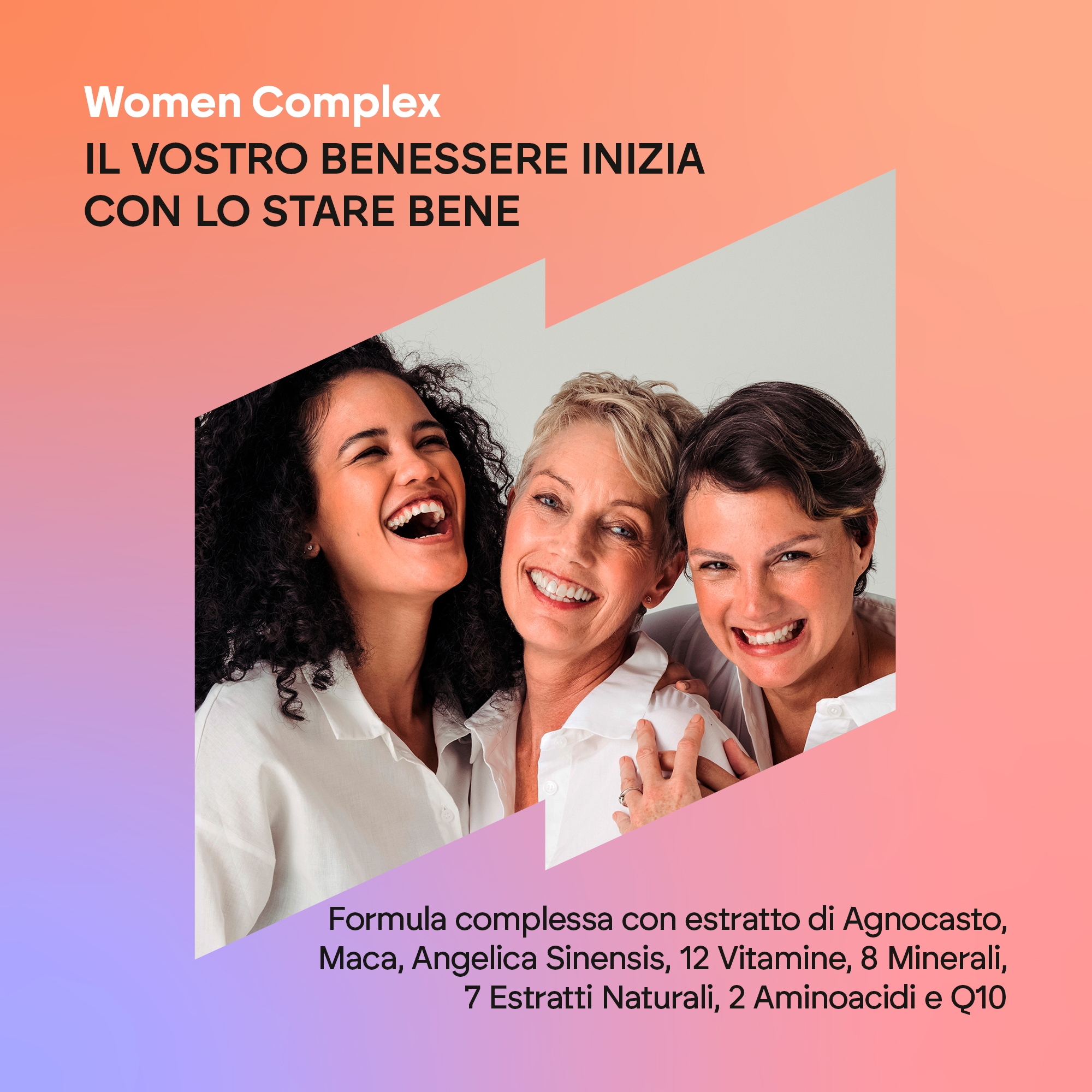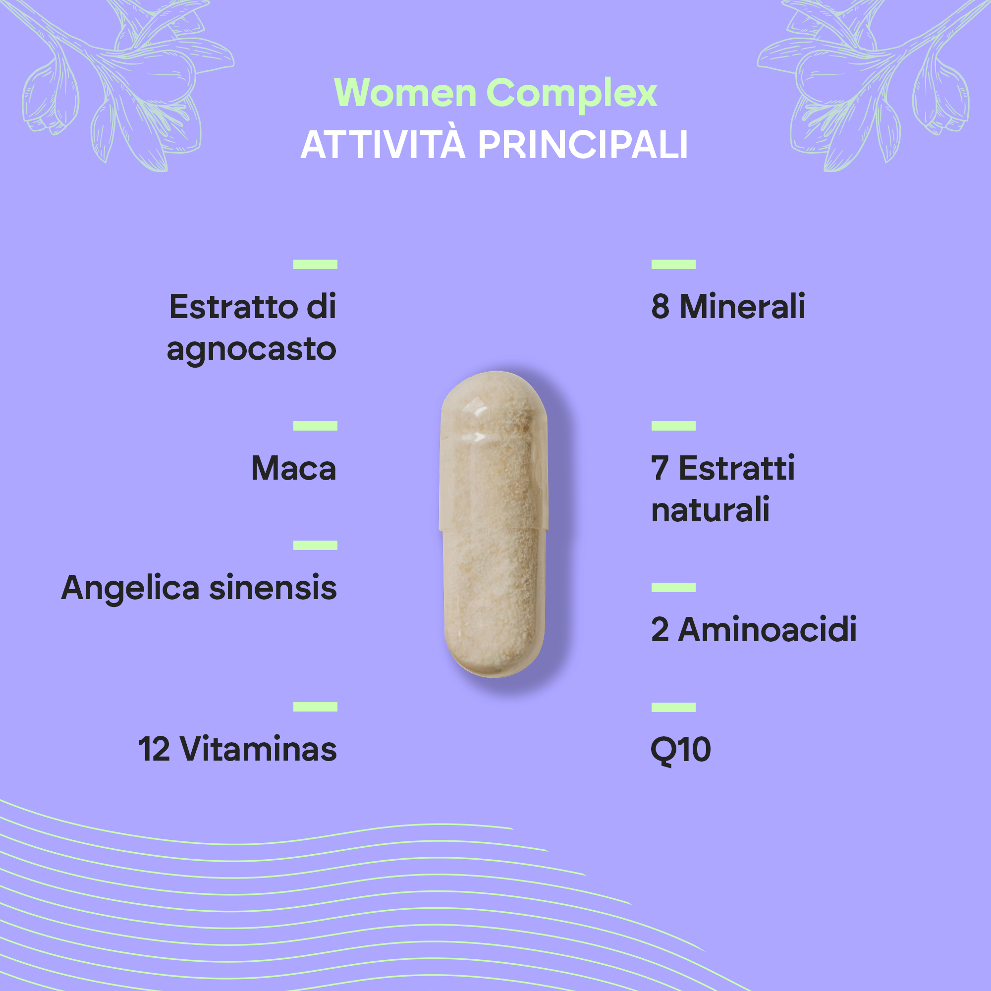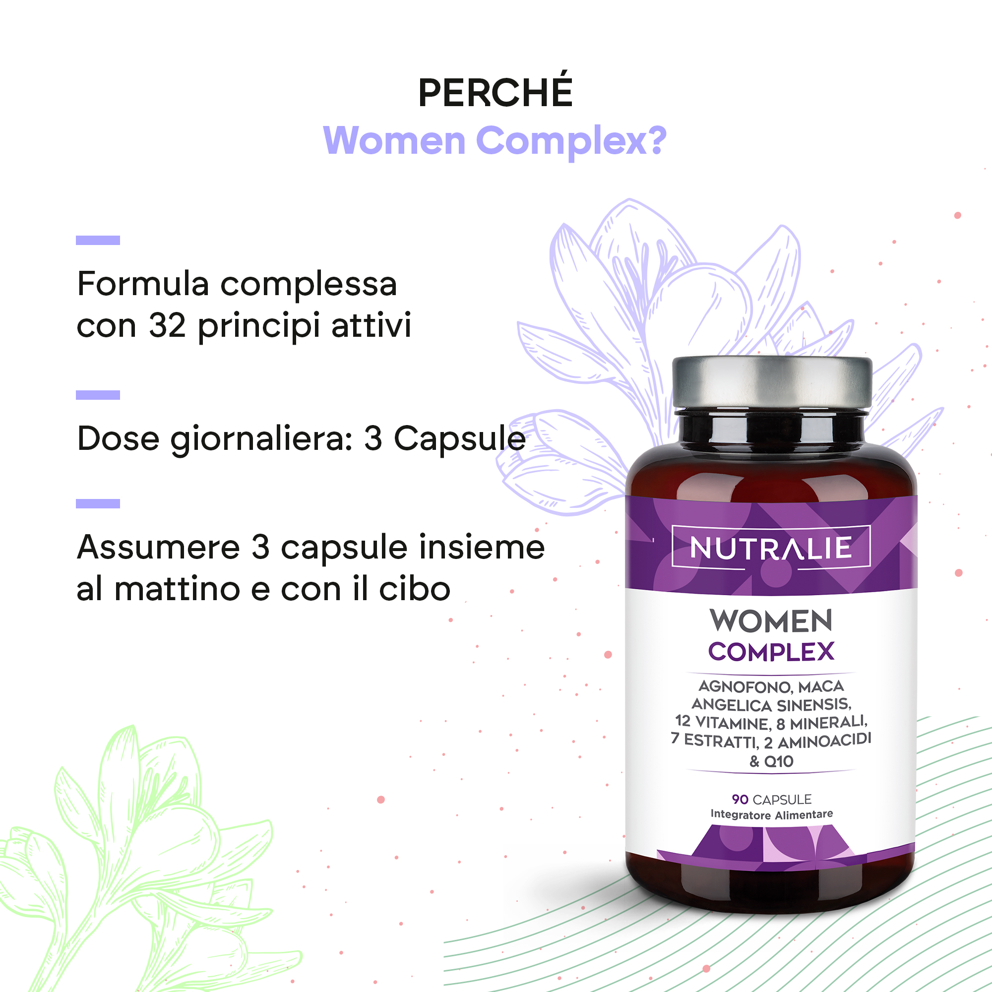 Women Complex è un integratore formulato con estratto di agnocasto, maca, angelica sinensis, 12 vitamine, 8 minerali, 7 estratti naturali, 2 aminoacidi e Q10.