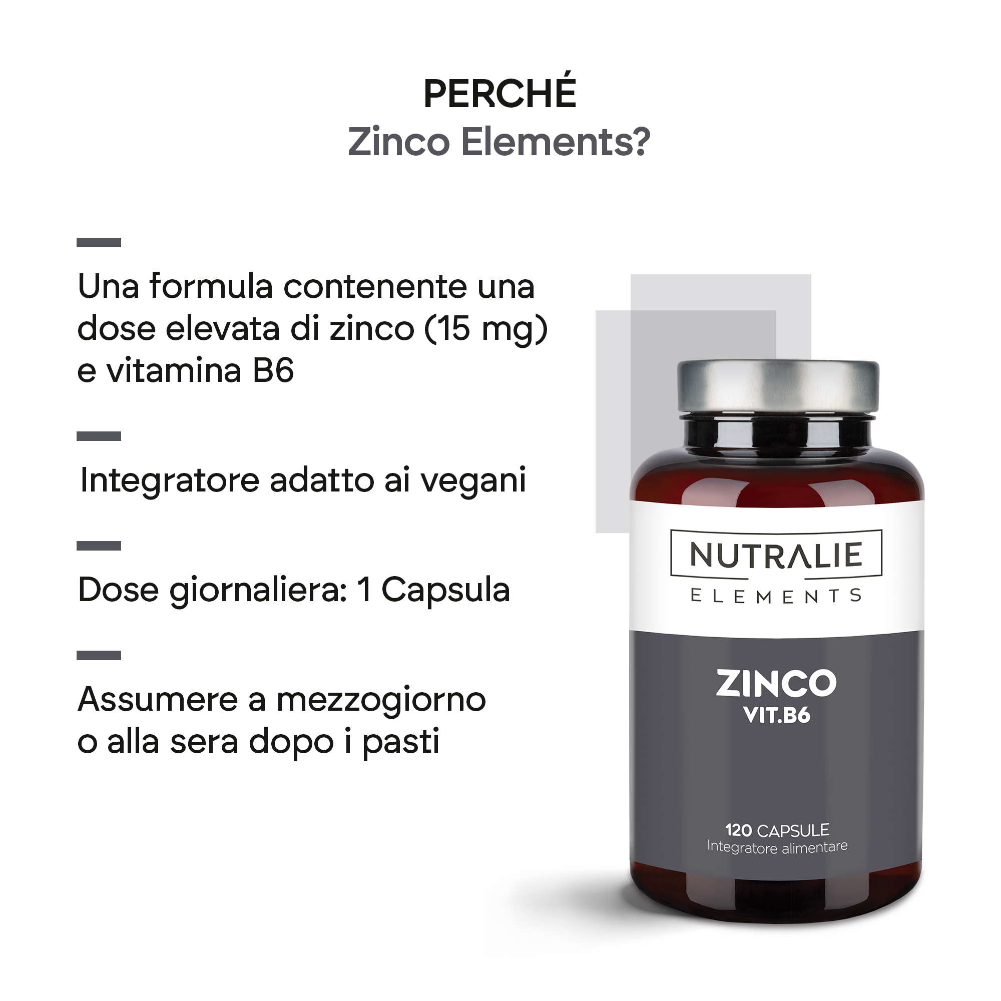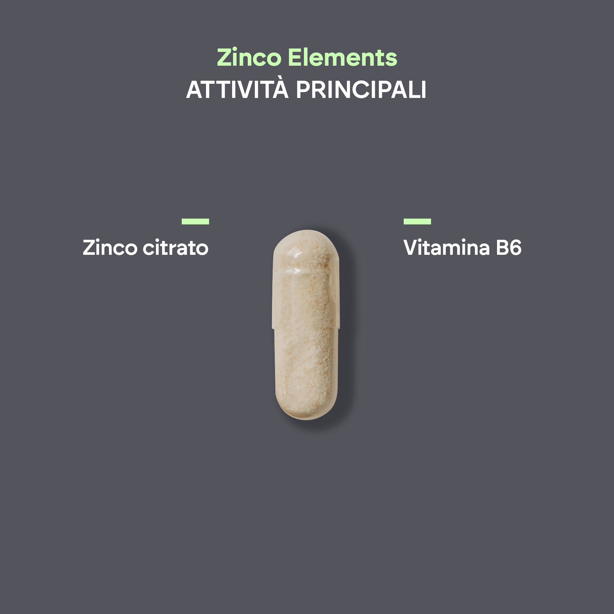 Zinc Elements è formulato con un alto dosaggio di zinco, che contribuisce al normale metabolismo dei macronutrienti e degli acidi grassi.