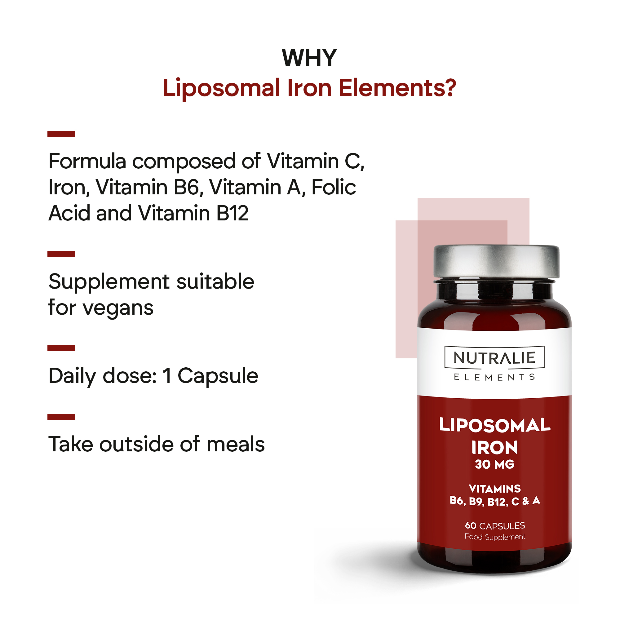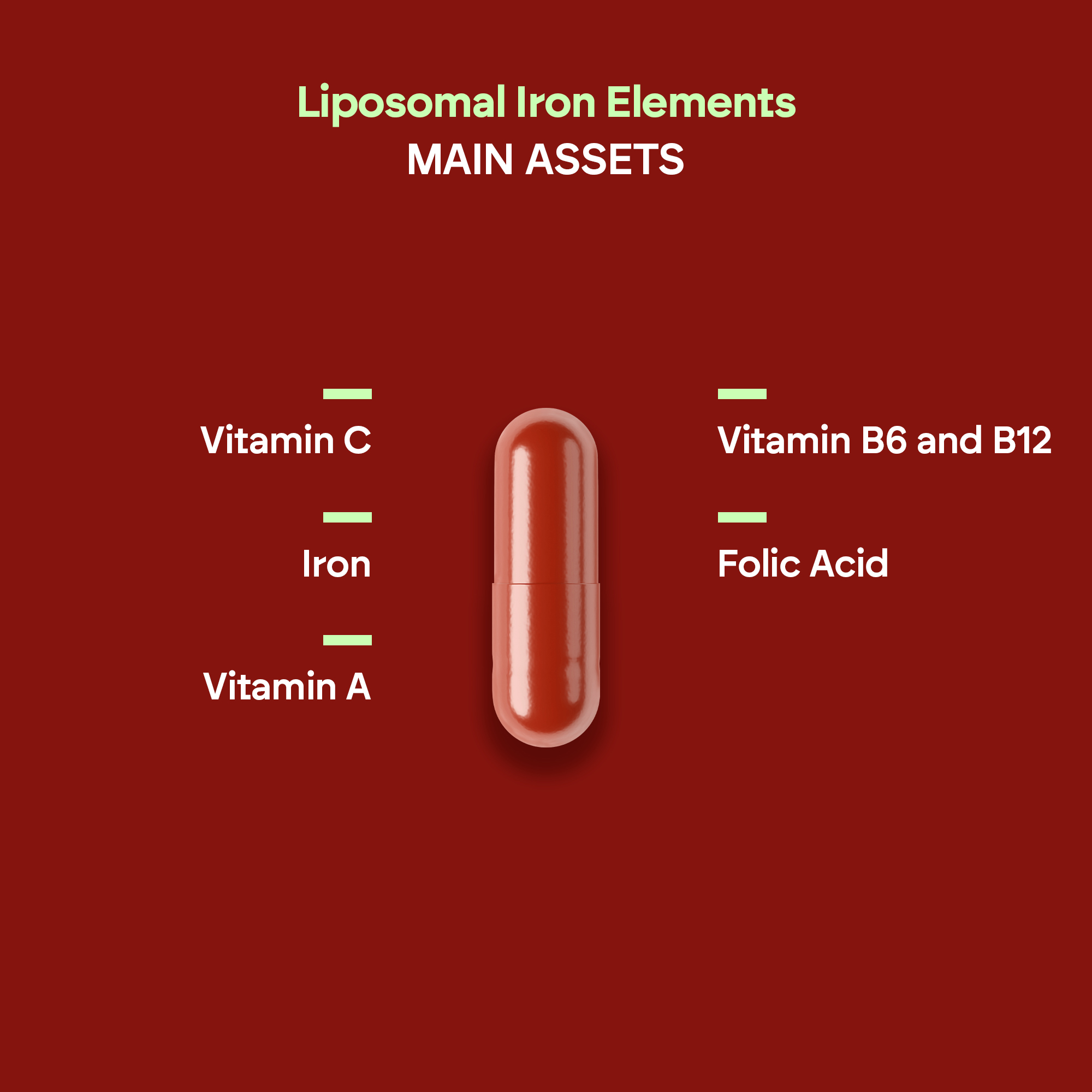 Liposomed iron (ferric pyrophosphate), capsule [glazing agent (hydroxypropylmethylcellulose), color (iron oxides)], bulking agent (microcrystalline cellulose), vitamin C (L-ascorbic acid), vitamin A (retinyl acetate), anti-caking agents (magnesium salts of fatty acids, silicon dioxide), vitamin B6 (pyridoxine hydrochloride), folic acid (pteroylmonoglutamic acid), vitamin B12 (cyanocobalamin).