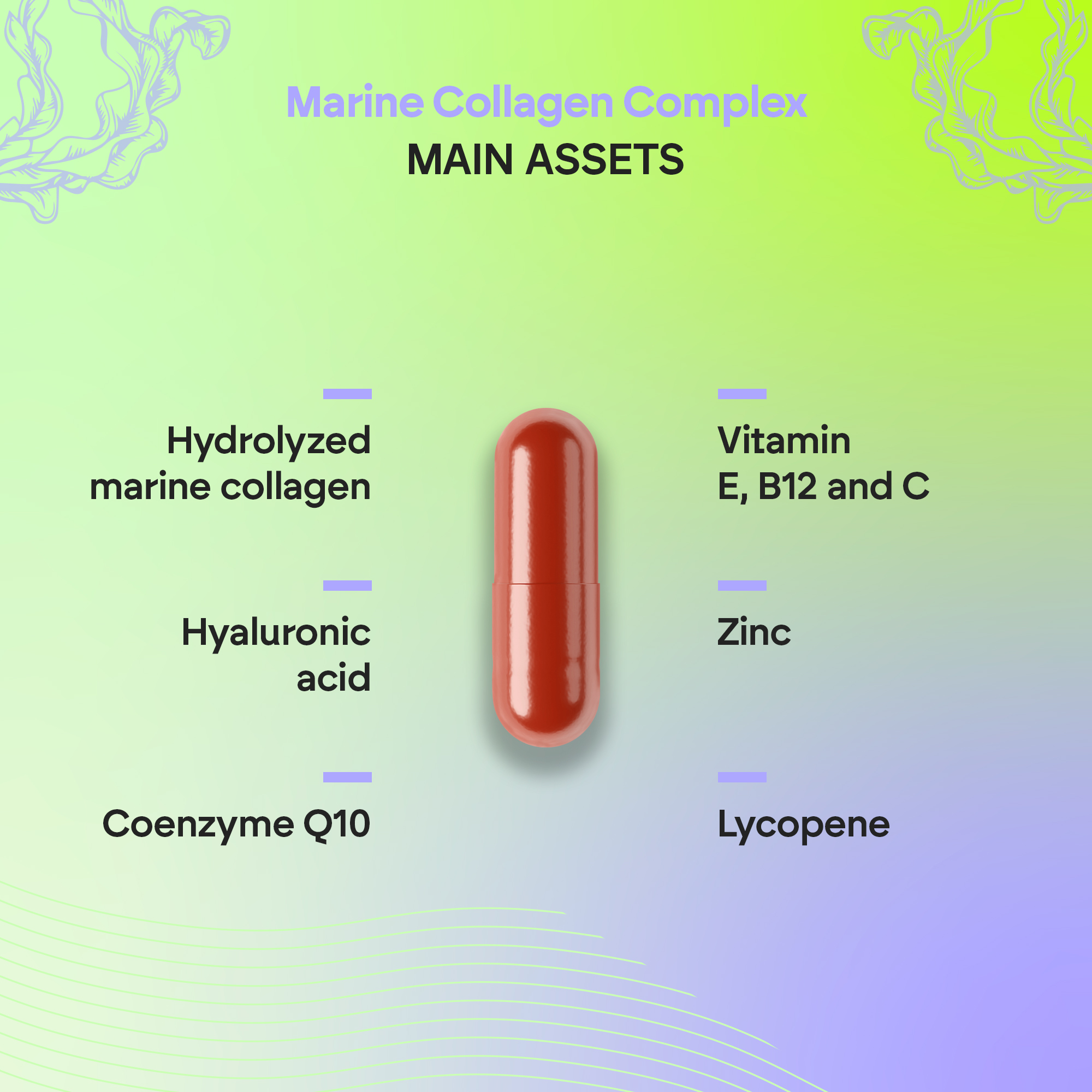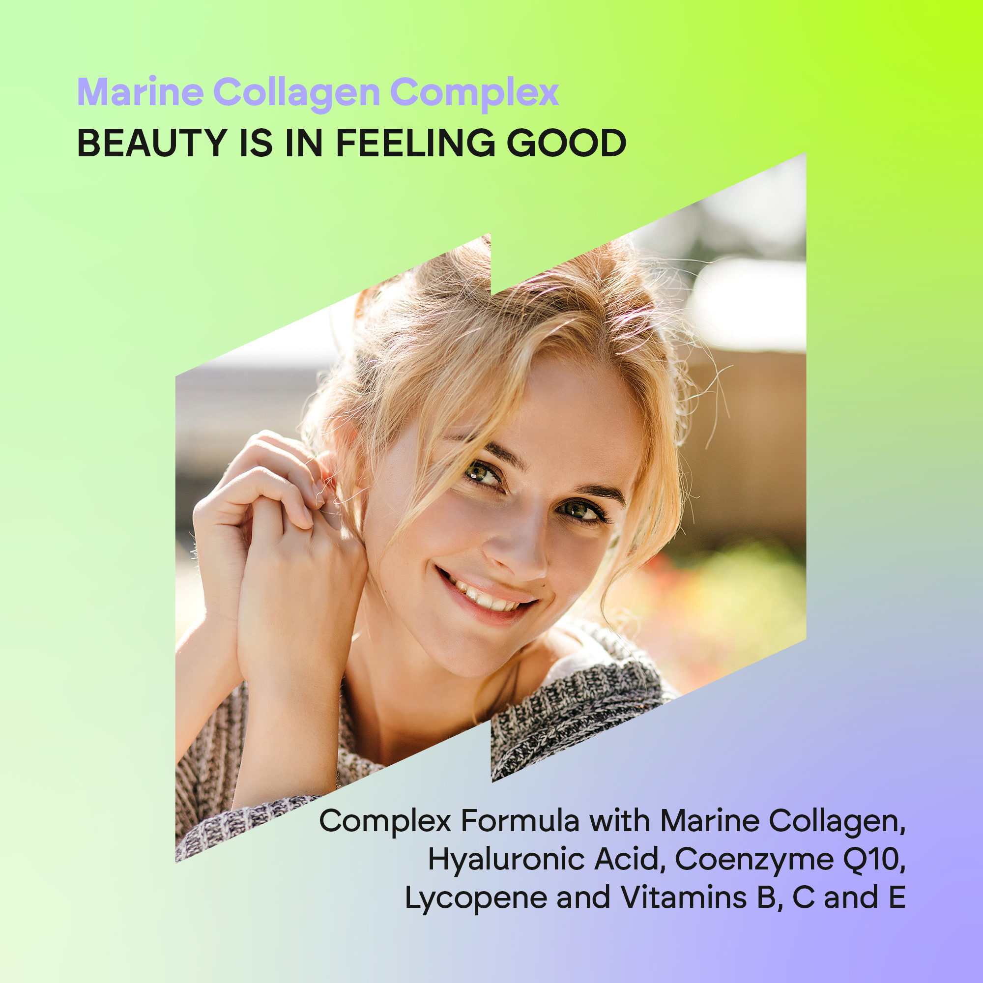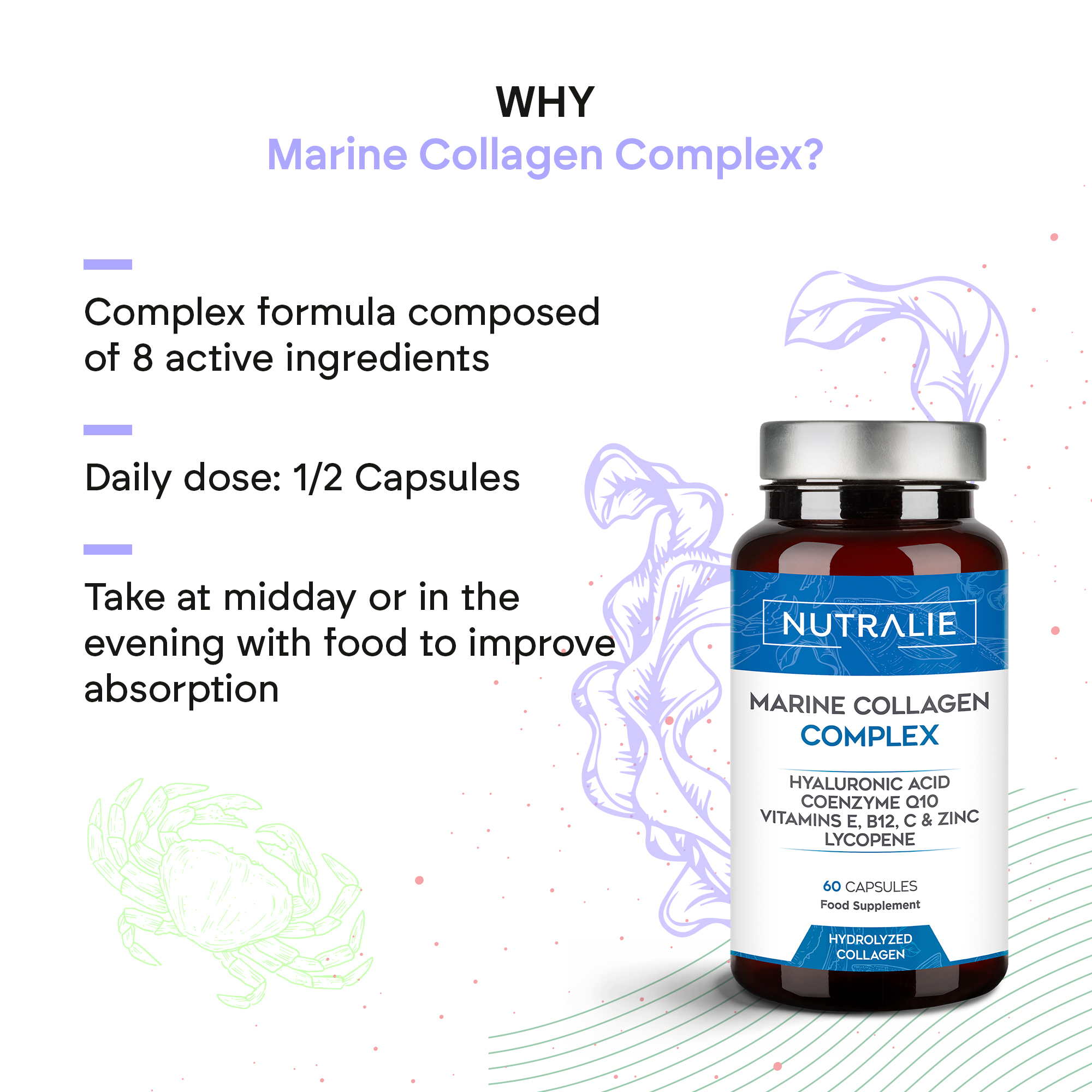 Nutralie Marine Collagen Complex contains 1000 mg of hydrolyzed marine collagen. It also contains 45 mg of hyaluronic acid, 15 mg of Q10, 25 mg of vitamin C, 9.1 mg of vitamin E, 2.5 µg of vitamin B12, and 7.5 mg of lycopene.