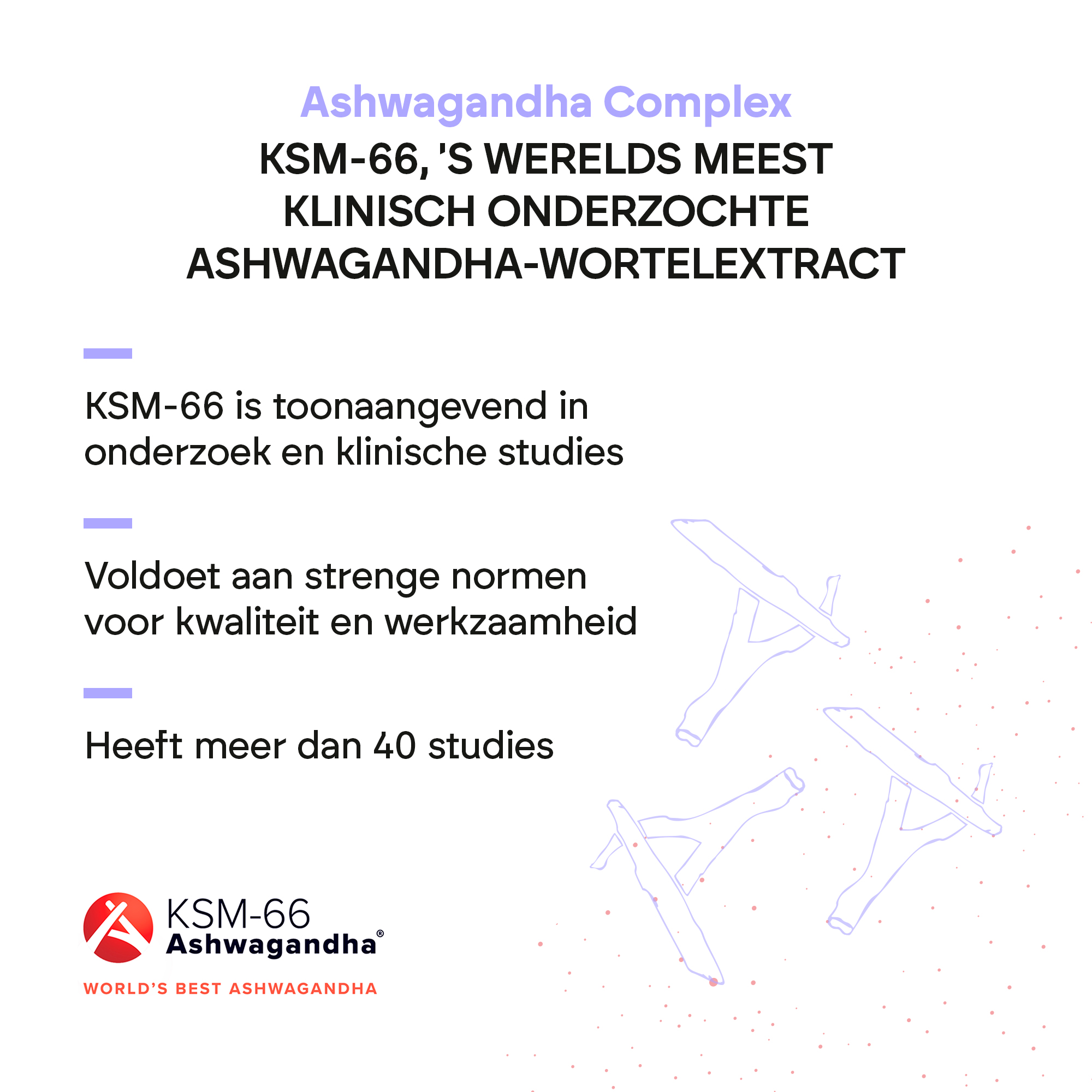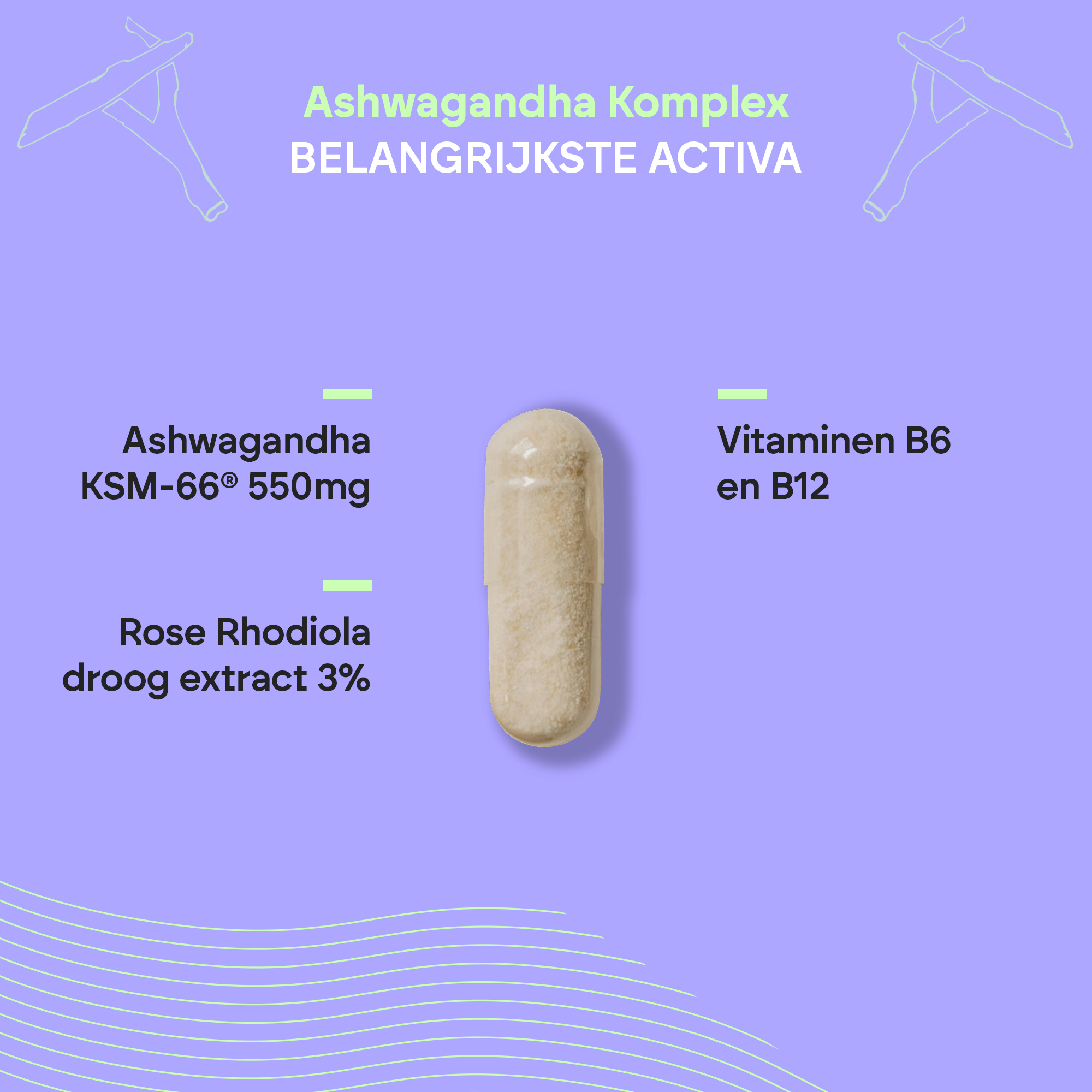 Ashwagandha Complex van Nutralie bevat 550 mg Ashwagandha KSM-66®, een geregistreerd ingrediënt dat het unieke extract van Ashwagandha-wortel met de hoogste concentratie bioactieve stoffen biedt en meer dan 40 kwaliteitscertificaten heeft. Ashwaganda is een traditioneel Indiaas kruid, ook bekend als Withania Somnifera, dat veel wordt gebruikt in de ayurvedische geneeskunde. Deze formule bevat ook vitamine B6 en B12.