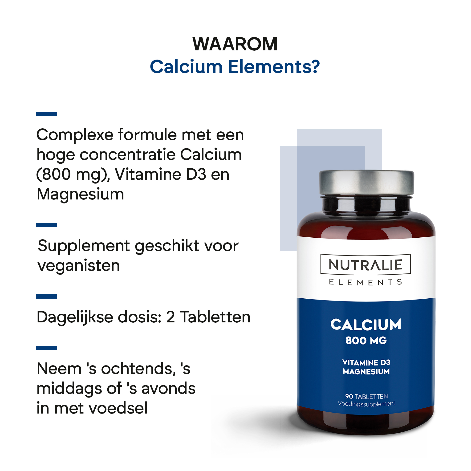 Nutralie Calcium Elements Supplement is een voedingssupplement samengesteld met calciumcarbonaat, magnesium en vitamine D. Calcium is noodzakelijk voor het behoud van normale botten.