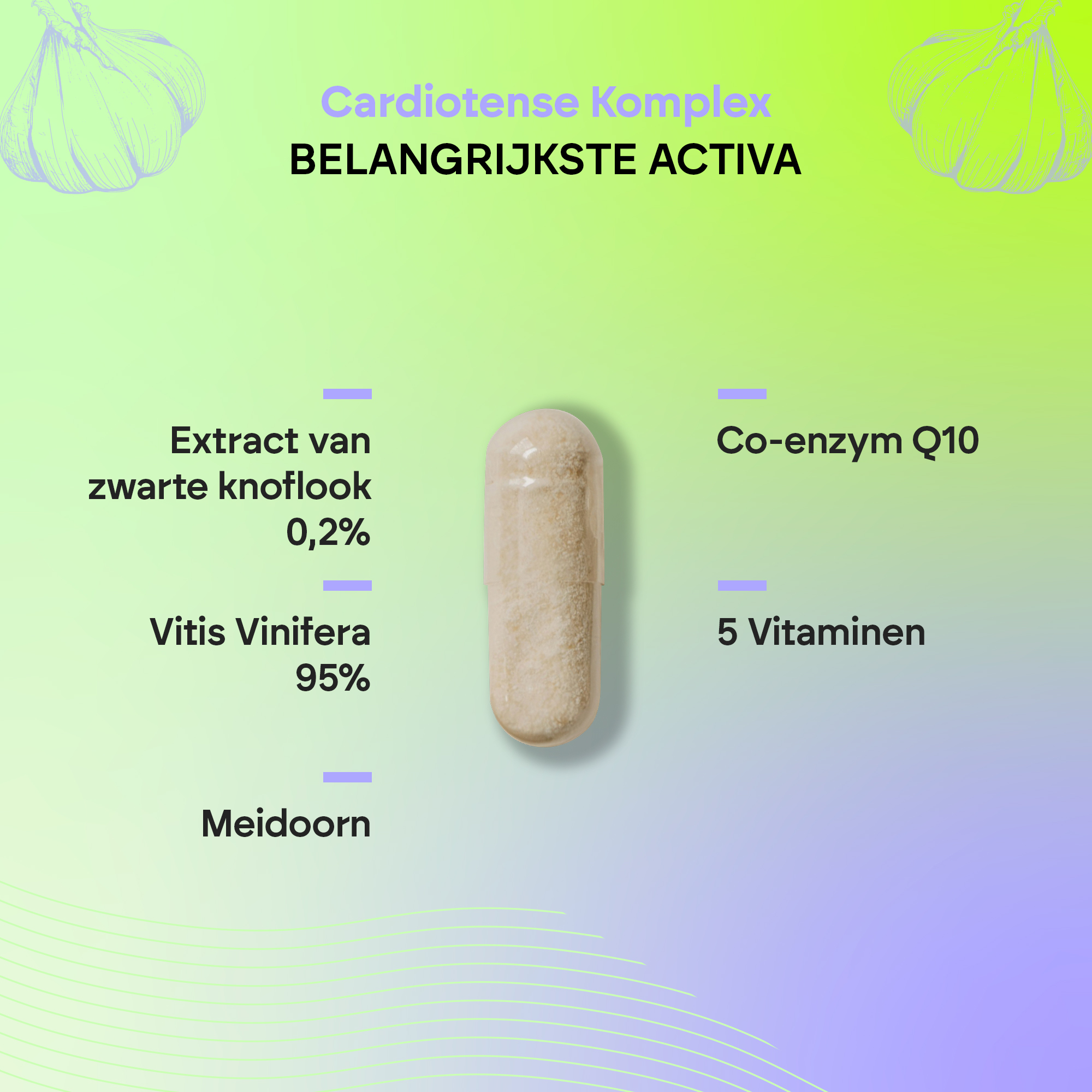 Deze Complex-formule bevat extract van zwarte knoflook, meidoorn, pijnboomschors, S-allylcysteïne en vitamines uit de B-groep.