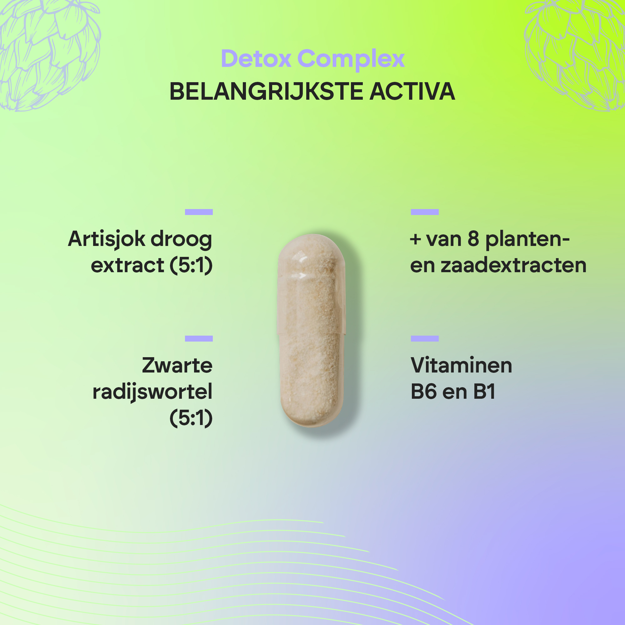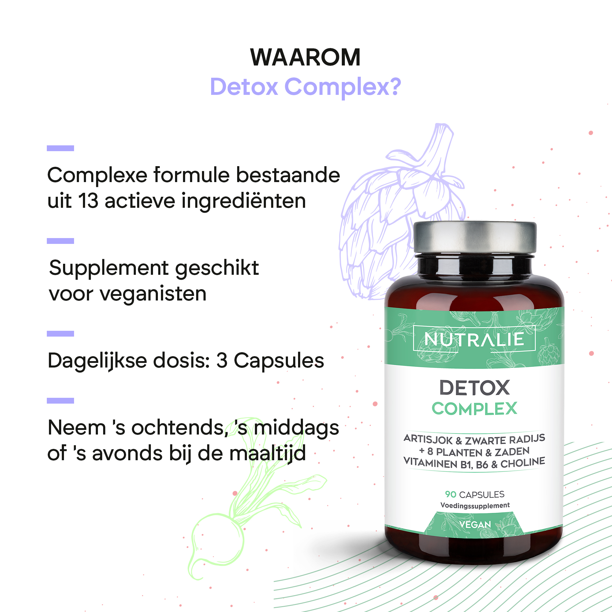 Ons Detox Complex supplement is samengesteld uit verschillende planten en zaden, waaronder artisjok en zwarte radijs. Deze natuurlijke formule bevat ook choline en vitamine B1 (thiamine) en B6, waarbij laatstgenoemde bijdraagt aan een normale energiestofwisseling.