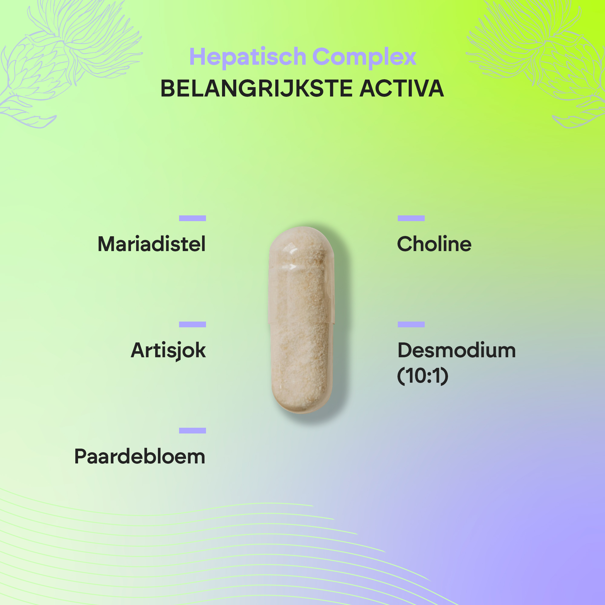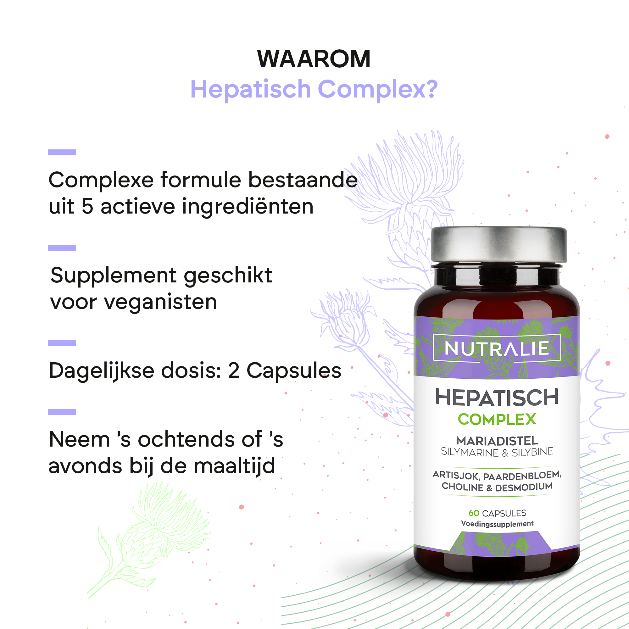 Nutralie’s Hepatic Complex is ontwikkeld met mariadistel (silymarine en silbine), artisjok, choline, paardenbloem en desmodium. De choline in de formule draagt bij aan het behoud van een normale leverfunctie.