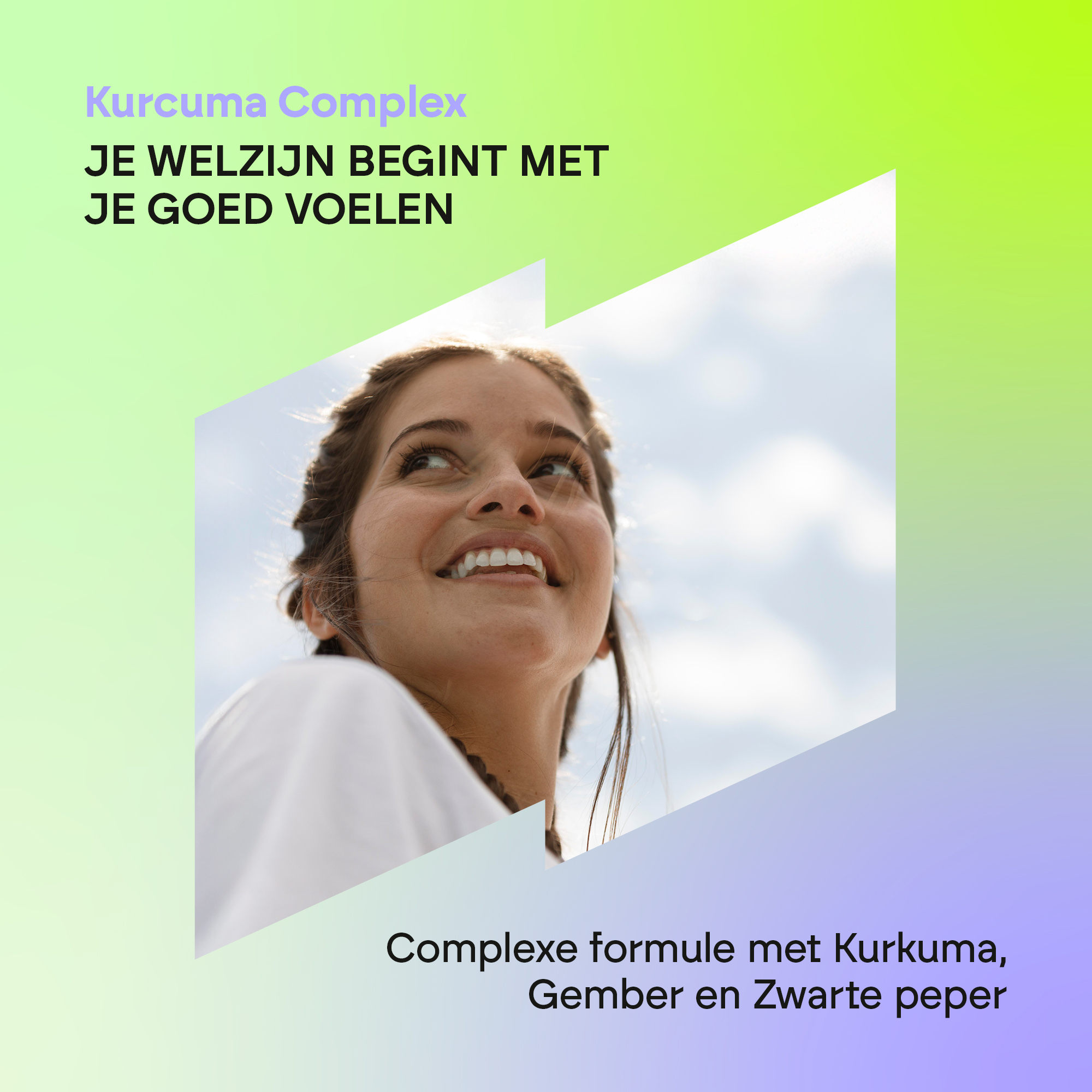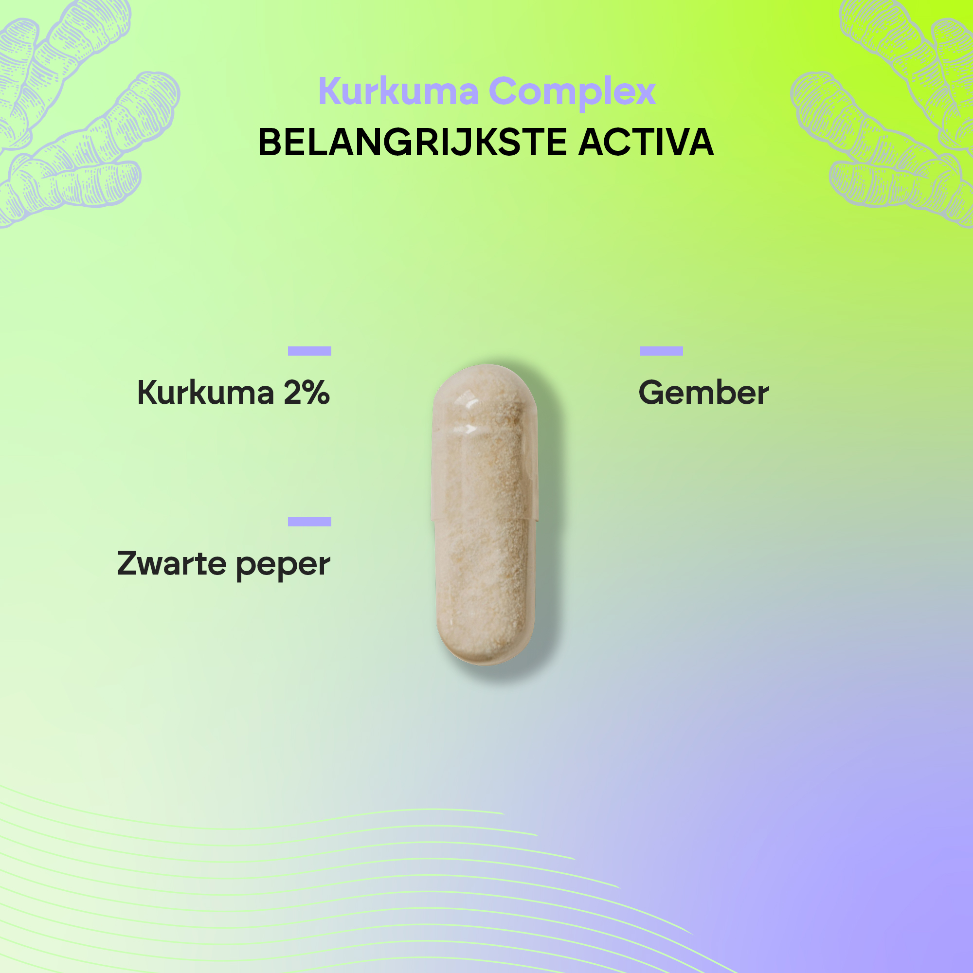 Kurkuma Complex wordt geleverd in een verpakking met 120 maagsapresistente, plantaardig gecoate capsules, geschikt voor veganisten.