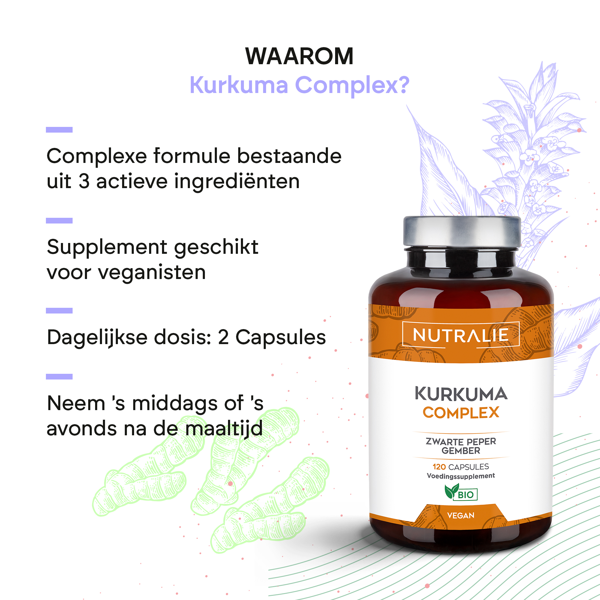 Het Kurkuma Complex-supplement van Nutralie bevat drie natuurlijke en biologische ingrediënten: kurkuma, gember en zwarte peper.