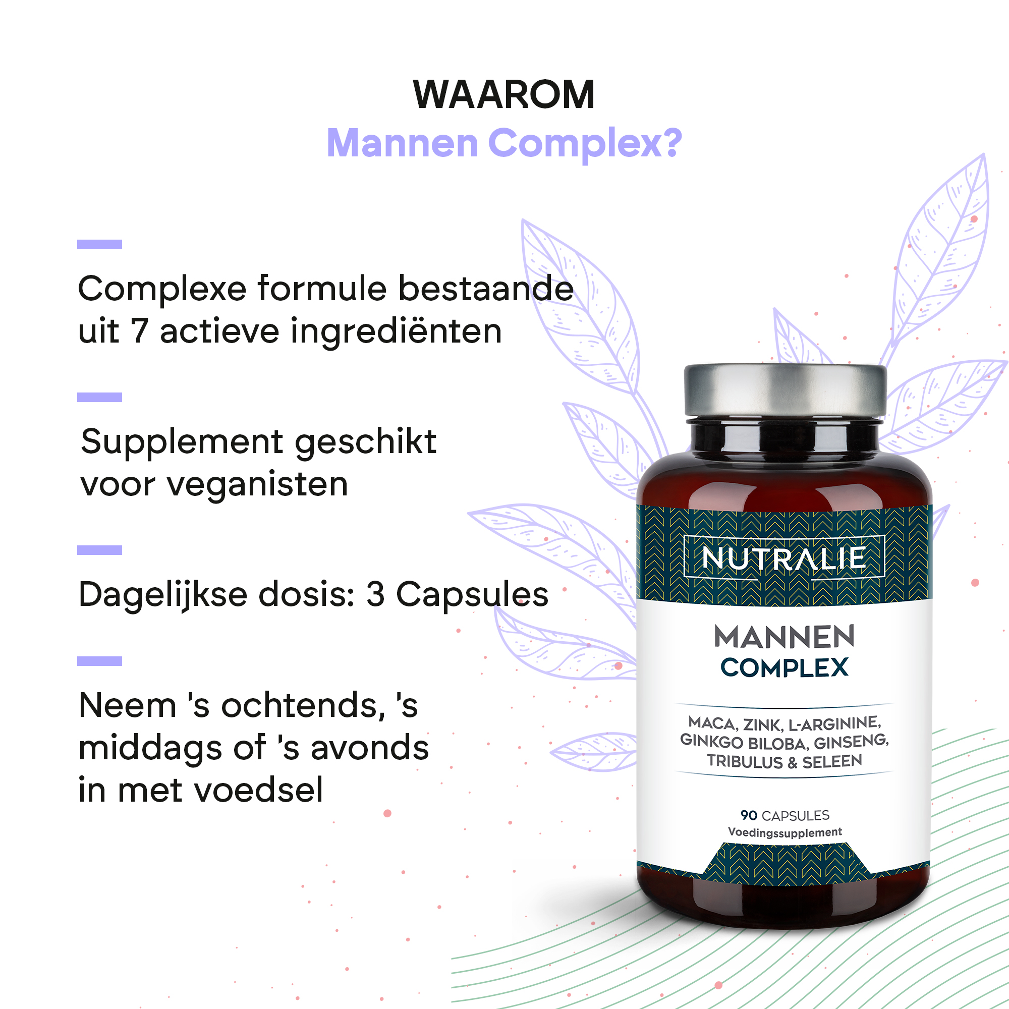 Nutralie Men Complex draagt dankzij zink bij aan het behoud van een normaal testosterongehalte. Zink draagt ook bij aan een normale vruchtbaarheid en voortplanting.