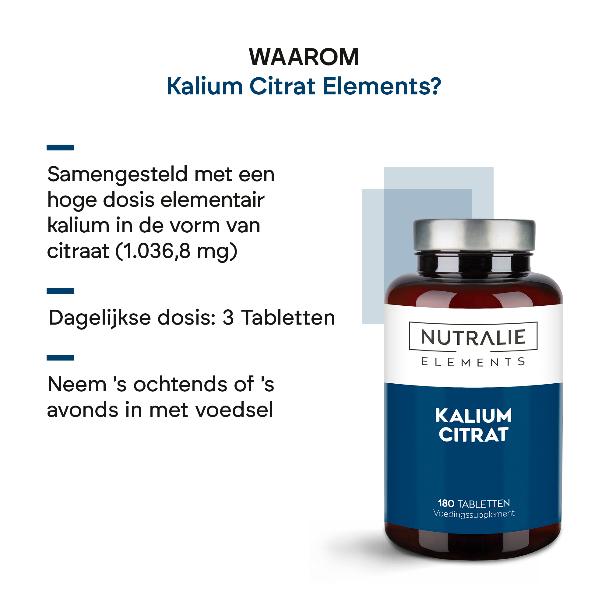 Nutralie's Kaliumcitraat Elementen is samengesteld met een hoge dosis elementair kalium in citraatvorm (1.036,8 mg).