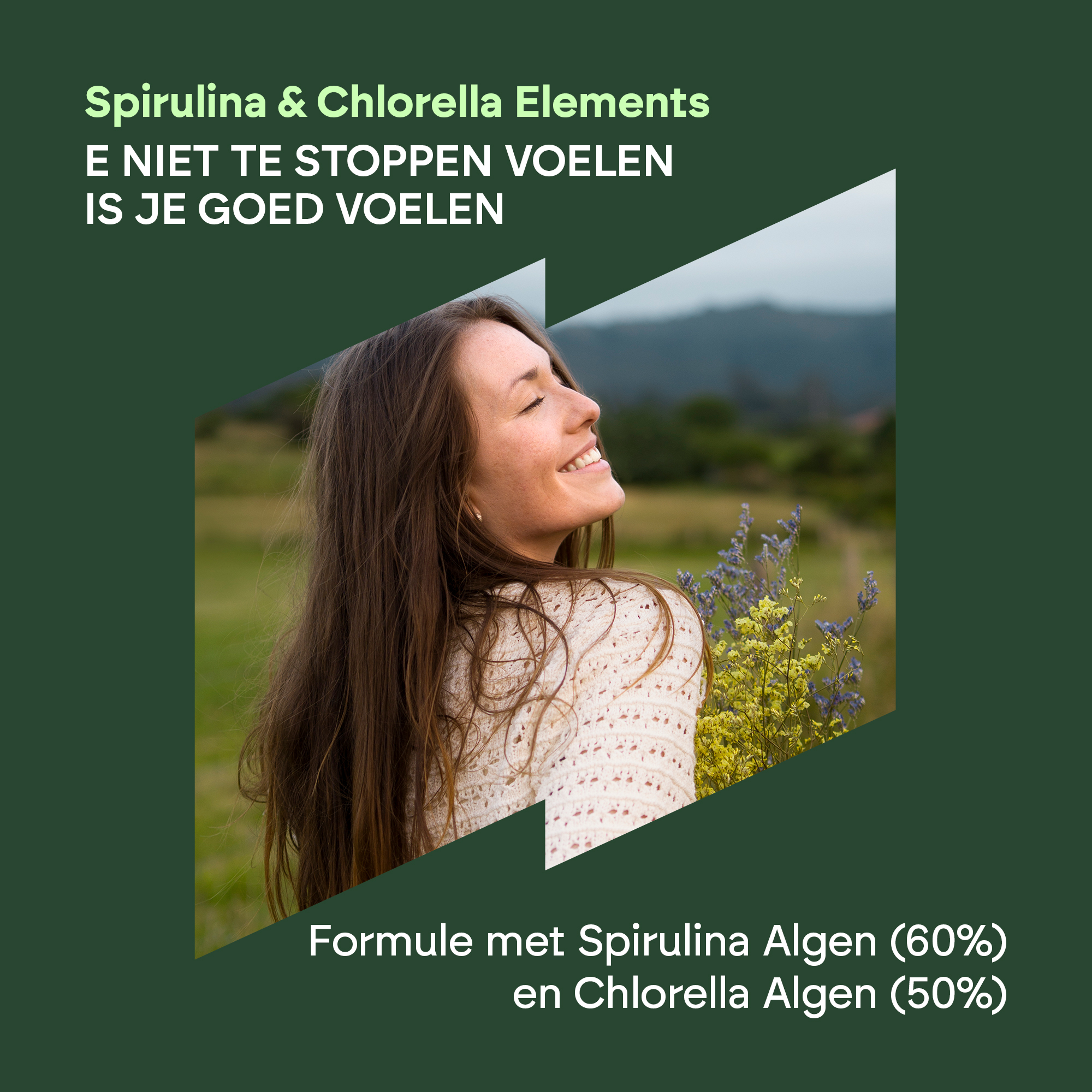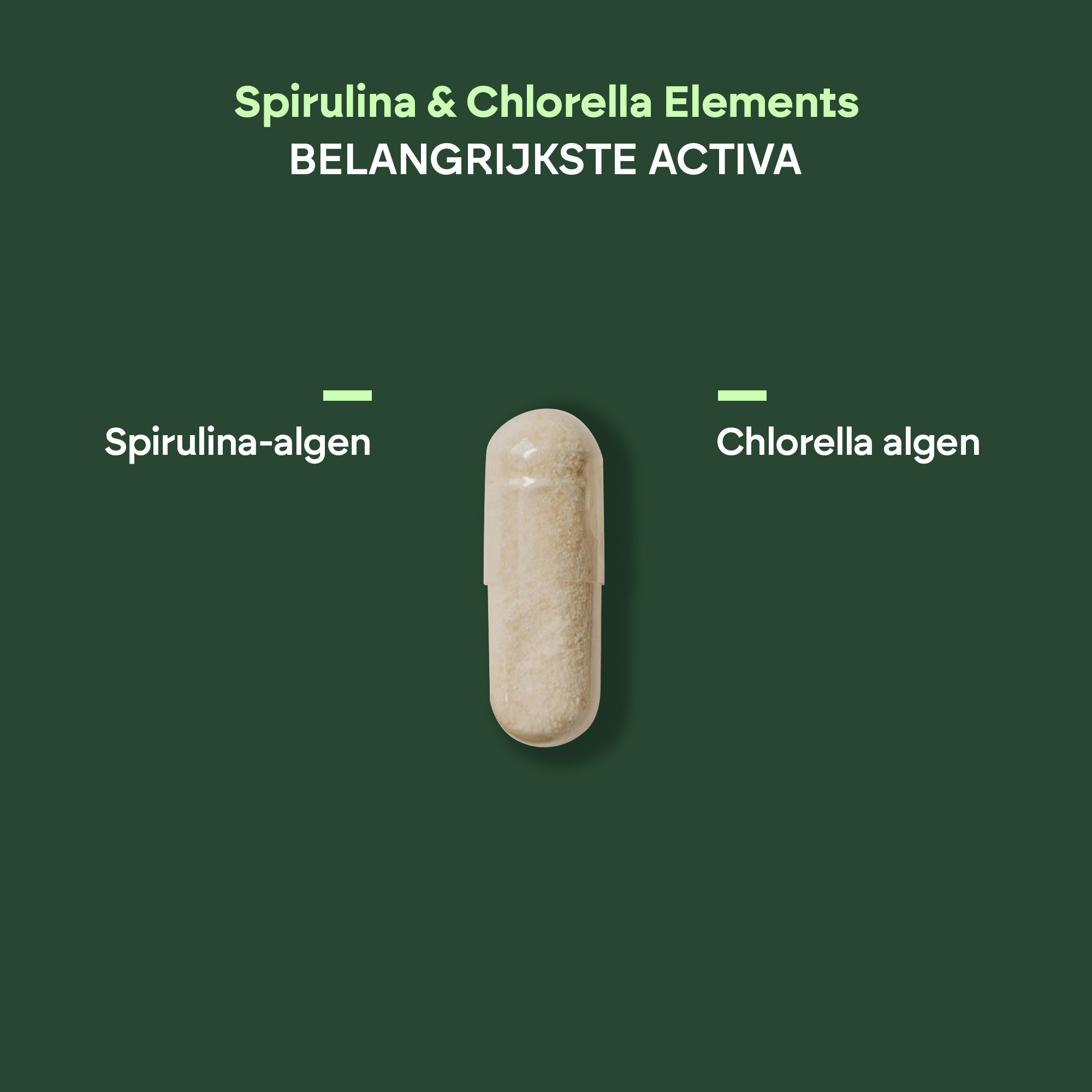 spirulina-algenpoeder (Spirulina platensis (Gomont) Geitler, eencellige algen), chlorella algenpoeder (Chlorella pyrenoidosa H. Chick, eencellige algen), Capsule: glansmiddel (hydroxypropylmethylcellulose), Vulstof (calciumfosfaten), antiklontermiddelen (siliciumdioxide en magnesiumzouten van vetzuren).
