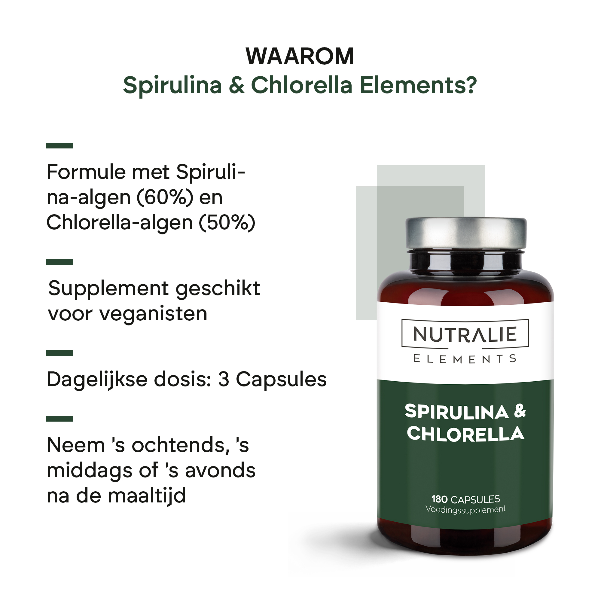 Spirulina & Chlorella Elements van Nutralie is een supplement samengesteld uit spirulina-algen (60%) en chlorella-algen (50%).