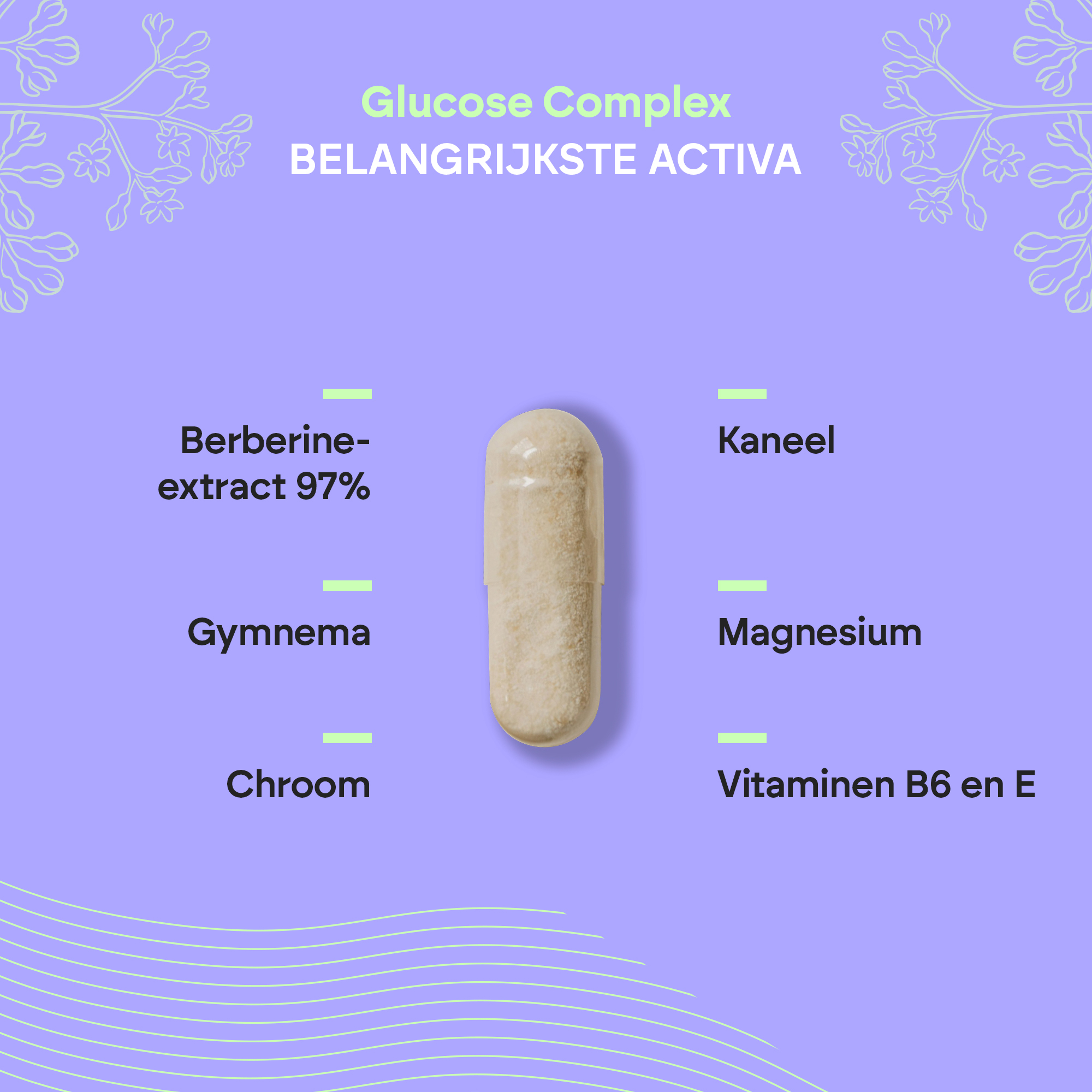 Magnesium (magnesiumbisglycinaat, magnesiumoxide), droog extract van de schors van de Indiase berberis (Berberis aristata DC.) 97% berberine, glansmiddel (hydroxypropylmethylcellulose), vulstof (microkristallijne cellulose), droog extract van kaneelschors (Cinnamomum zeylanicum Blume), droog extract van gymnemablad (Gymnema sylvestre (Retz) R.Br.), droog extract van witte moerbeiblad (Morus alba L.) 1% 1-deoxynojirimycine (DNJ), droog extract van citroenfruit (Citrus limon (L.) Osbeck), droog extract van appelfruit (Malus domestica Borkh.) 50% D-galacturonzuur (pectine), droog extract van bittere meloenfruit (Momordica charantia L.) 1,8% charantine, droog extract van fenegriekzaad (Trigonella) foenum-graecum L.) 50% saponinen, antiklontermiddel middel (magnesiumzouten van vetzuren), vitamine E (DL-alfa-tocoferylacetaat), droog extract van zwarte pepervrucht (Piper nigrum L.), vitamine B6 (pyridoxinehydrochloride), chroom (chroompicolinaat).