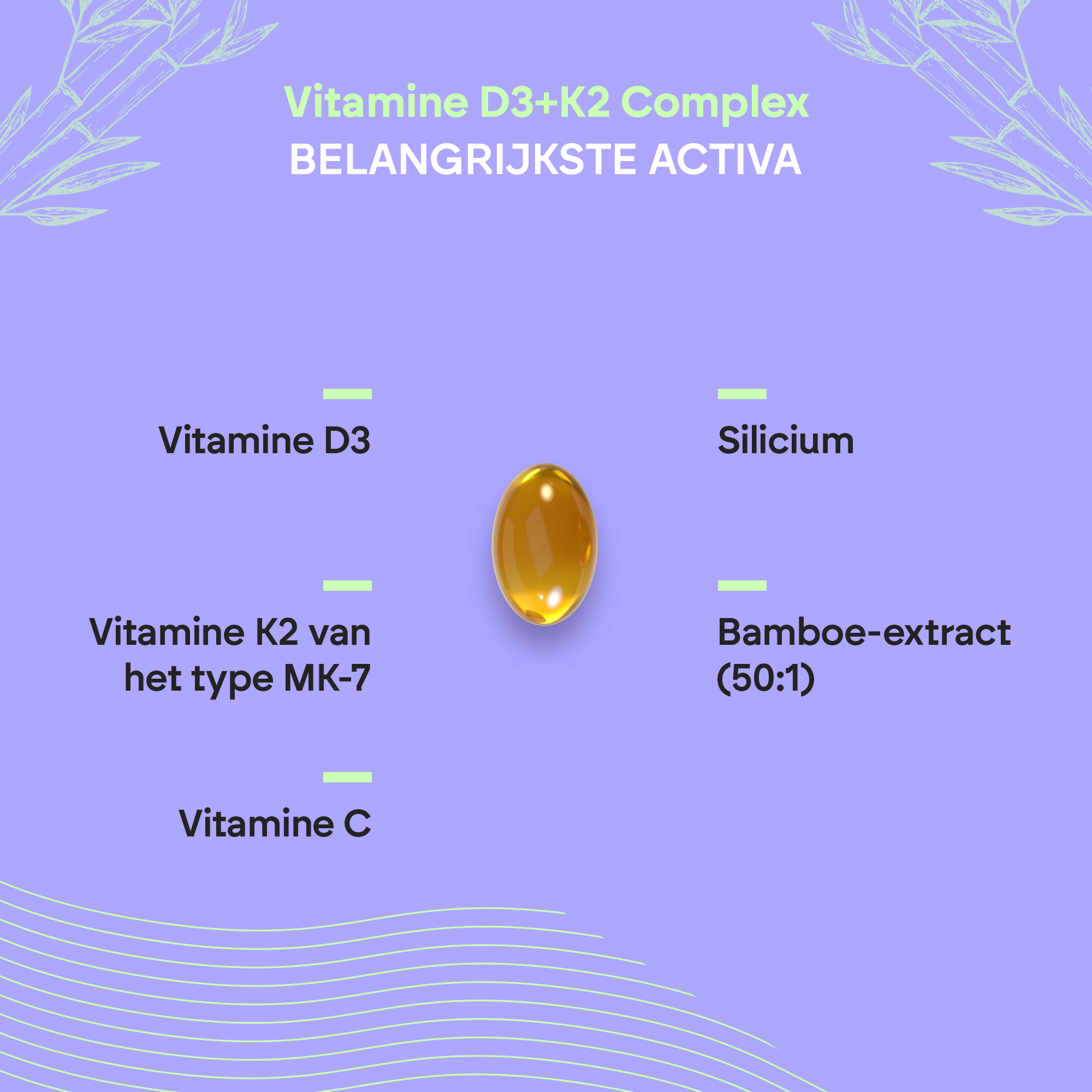 Vitamine D3 + K2 Complex is een supplement samengesteld uit vitamine D3 (cholecalciferol) 10.000 IE, vitamine K2 (menachinon) van het type MK-7 en vitamine C.