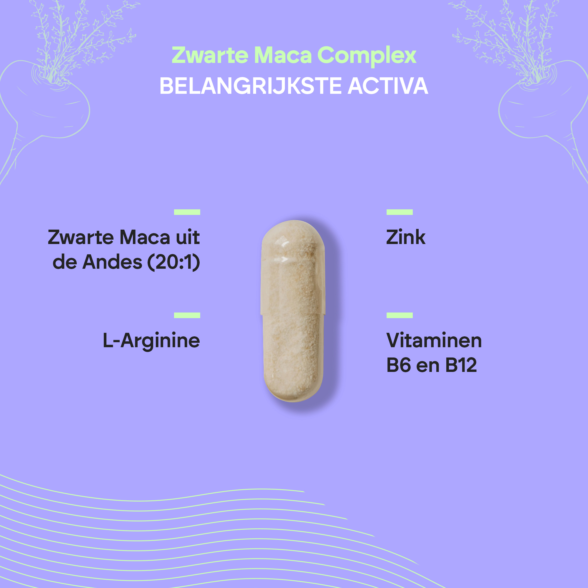 Onze Black Maca Complex-capsules bevatten zwarte maca uit de Andes, L-arginine, zink en vitamines. Zink draagt bij aan het behoud van een normaal testosterongehalte en aan een normale vruchtbaarheid en voortplanting.