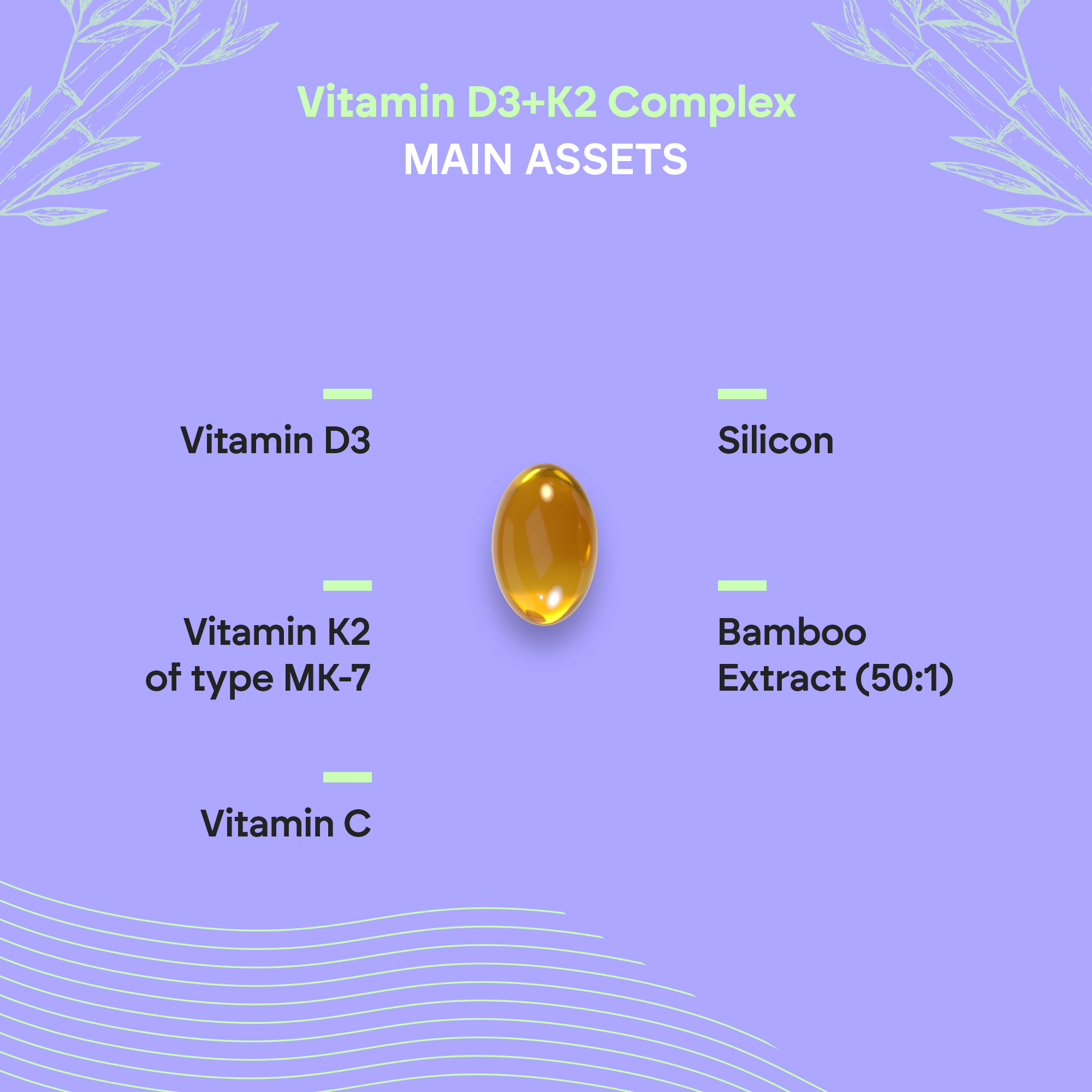Carrier: virgin olive oil (Olea europaea L.), capsule (gelatine, humectant: glycerine, water, colours: iron oxides and hydroxides), bamboo dry extract (Bambusa vulgaris Schrad., leaf and stem), L-ascorbic acid (vitamin C), cholecalciferol (vitamin D), thickener: yellow beeswax, menaquinone (vitamin K2). C