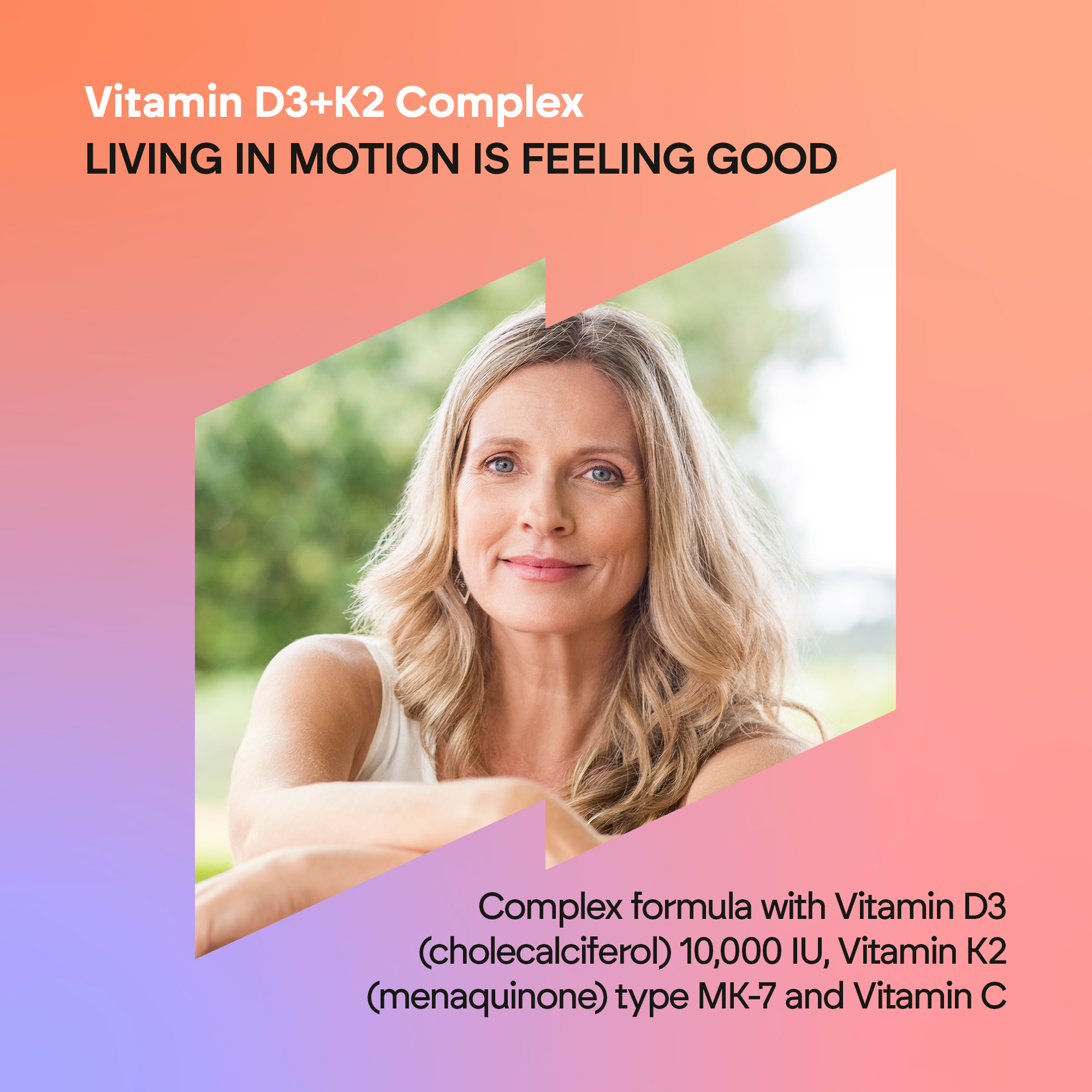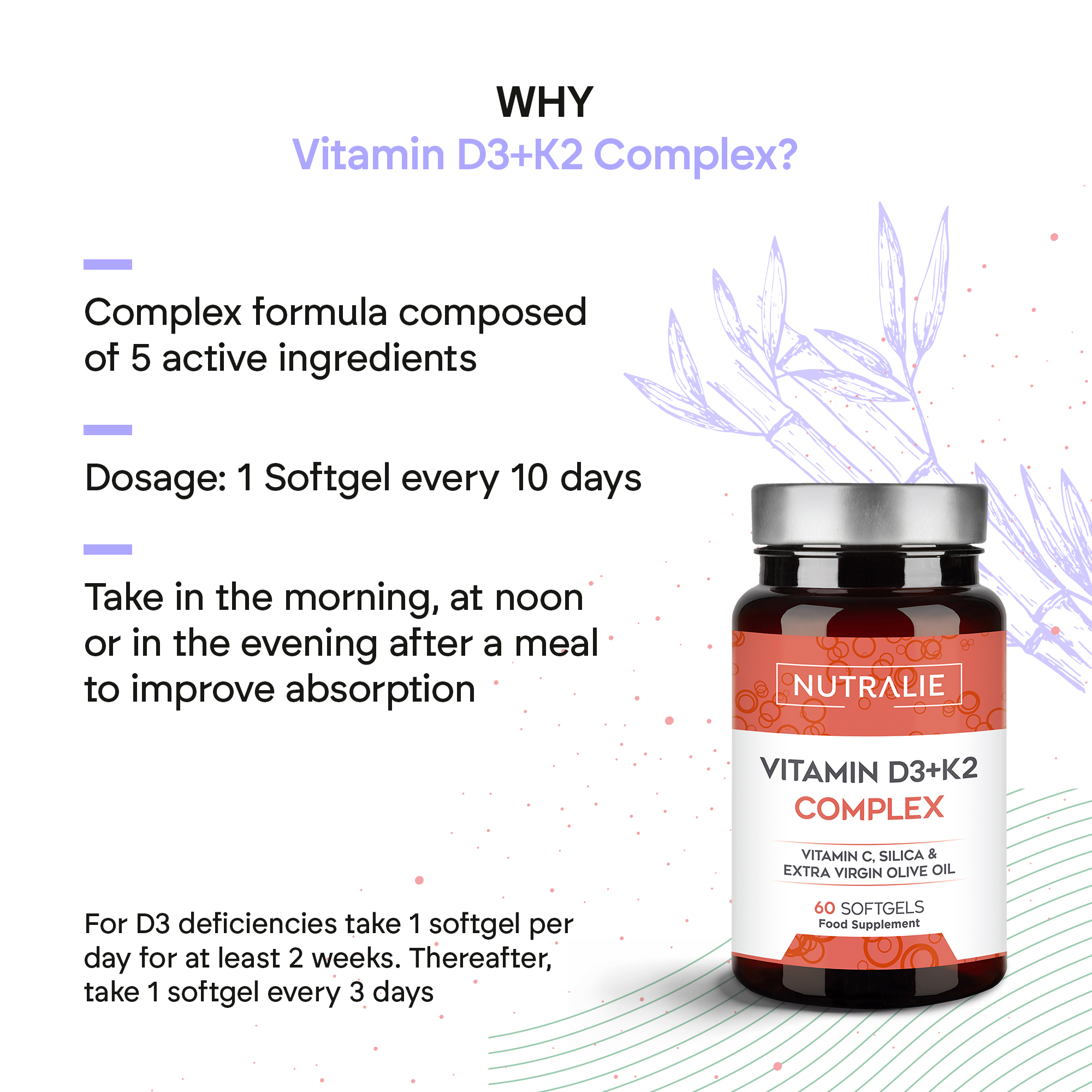 Vitamin D3 + K2 Complex is a supplement formulated with Vitamin D3 (cholecalciferol) 10,000 IU, Vitamin K2 (menaquinone) type MK-7 and Vitamin C.