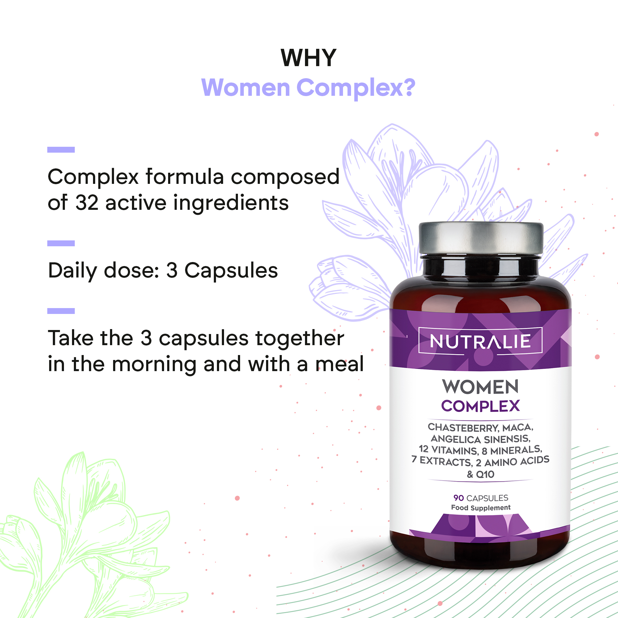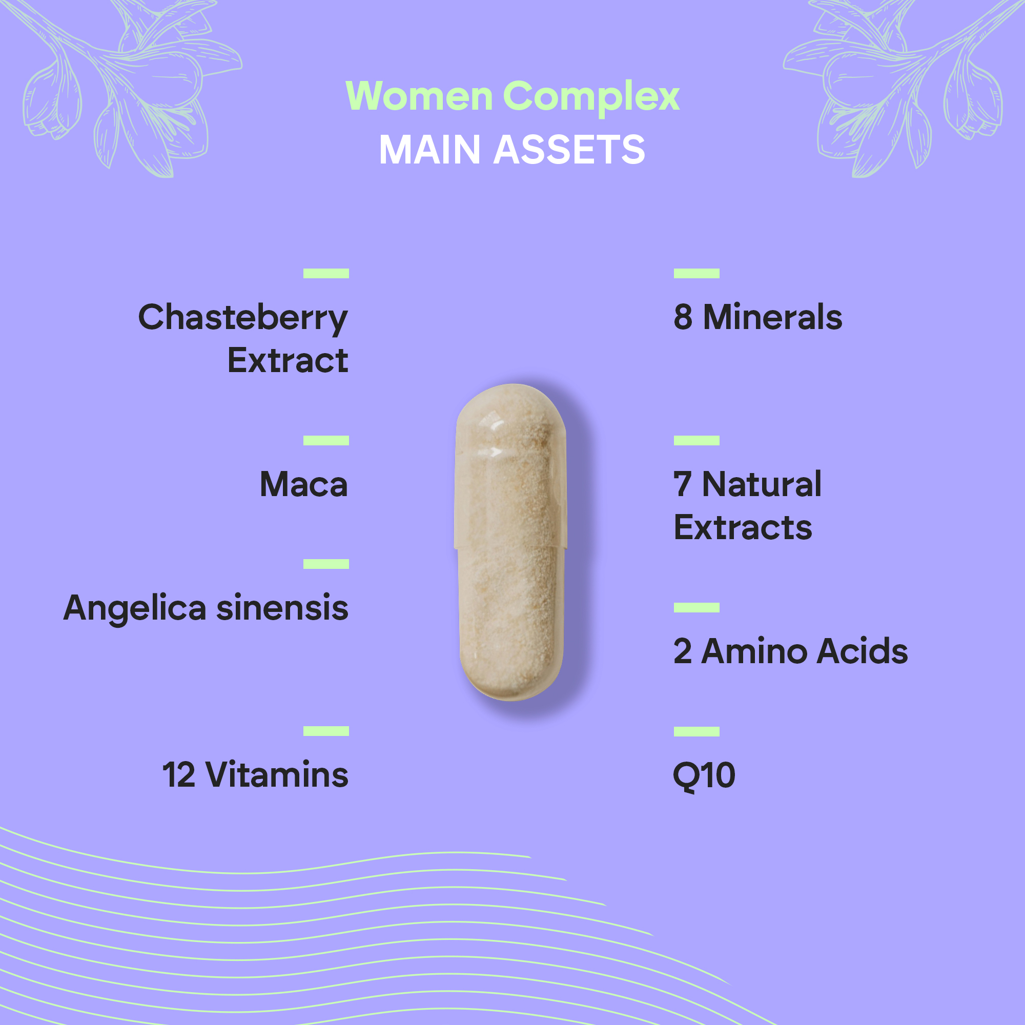 Women Complex is a supplement formulated with chaste tree extract, maca, Angelica sinensis, 12 vitamins, 8 minerals, 7 natural extracts, 2 amino acids and Q10.